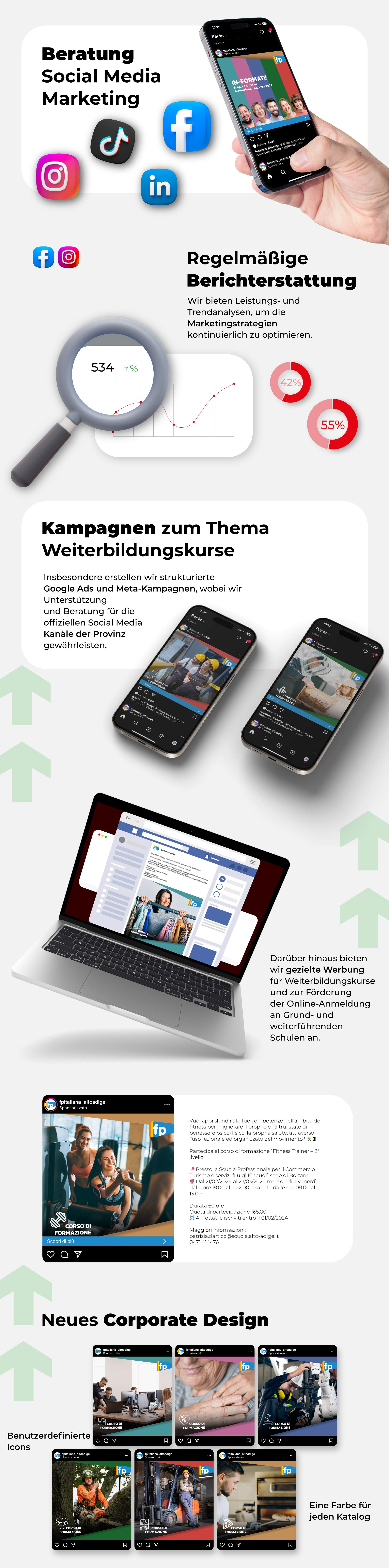 Insbesondere erstellen wir strukturierte Google Ads und Meta-Kampagnen, wobei wir Unterstützung und Beratung für die offiziellen Social Media Kanäle der Provinz gewährleisten. Darüber hinaus bieten wir gezielte Werbung für Weiterbildungskurse und zur Förderung der Online-Anmeldung an Grund- und weiterführenden Schulen an.