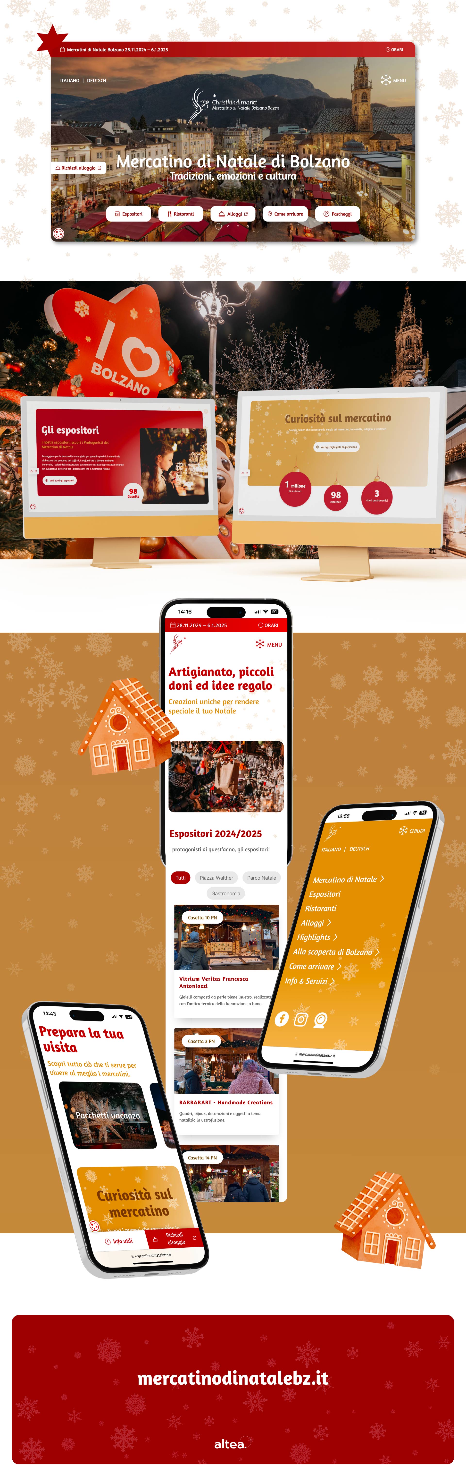 Abbiamo sviluppato un progetto semplice e funzionale, emozionante e innovativo, per il nuovo sito web del Mercatino di Natale di Bolzano. L'obiettivo principale del sito è fornire informazioni in modo chiaro e intuitivo.