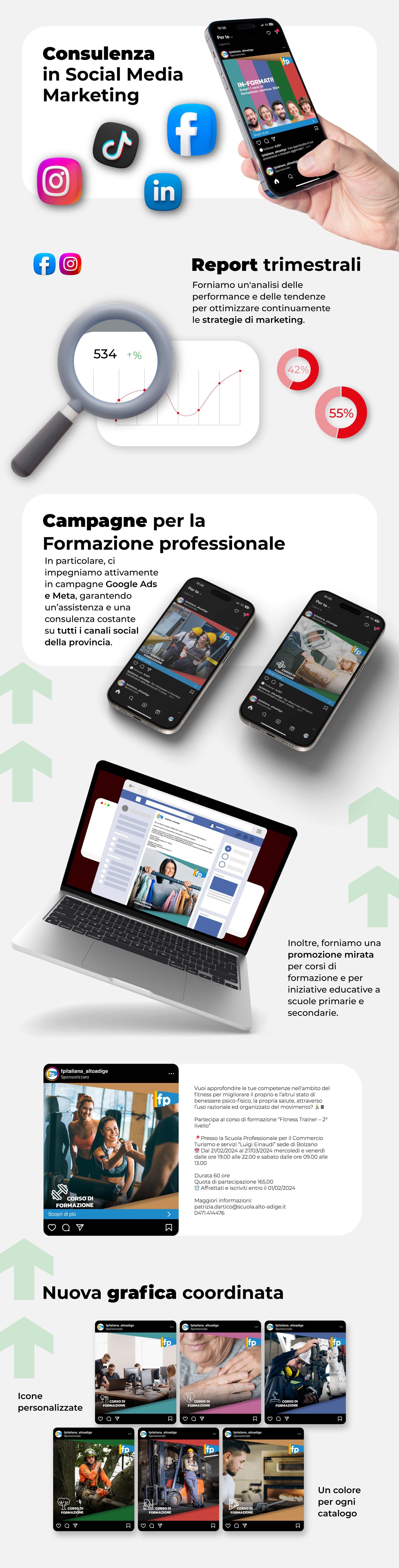 In particolare, ci impegniamo attivamente in campagne Google Ads e Meta, garantendo un’assistenza e una consulenza costante su tutti i canali social della provincia. Inoltre, forniamo una promozione mirata per corsi di formazione e per iniziative educative a scuole primarie e secondarie.